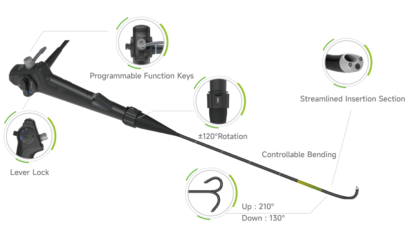 Lever lock to maintain a fixed angle at the distal end; rotation function of the insertion section to enhance the field of view